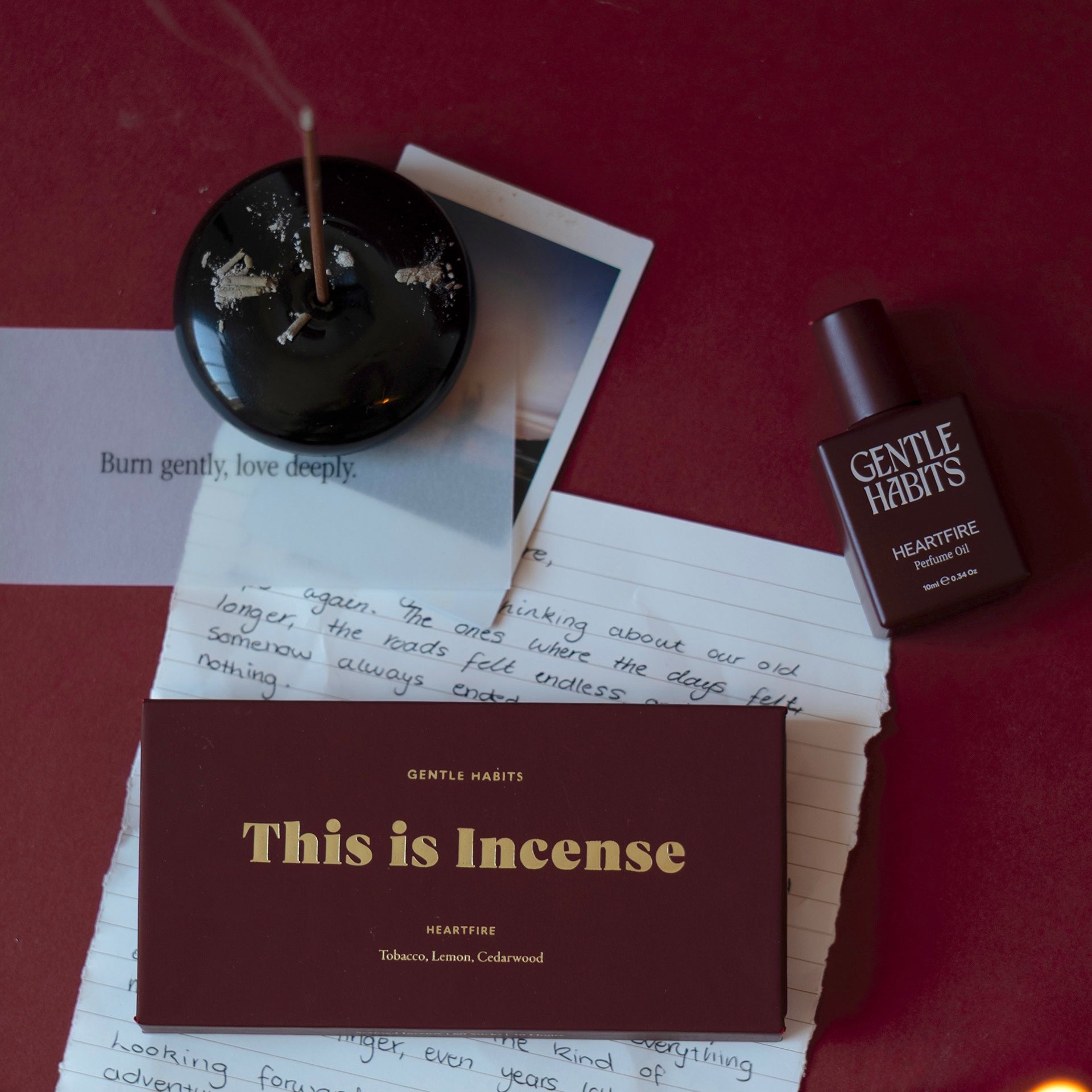 The scent unfolds gradually, mirroring the way presence grows when we stop rushing. It opens with a soft brightness of lemon before warming into a smoky tobacco heart, then settling into grounding cedarwood that lingers calmly in the background. A long-lasting scent that is subtle and inviting.